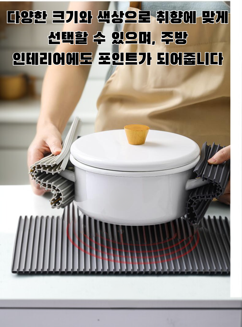 ● 고품질 실리콘 소재로 제작되어 내열성과 내구성이 뛰어나며, 오랜 시간 사용해도 변형이나 손상이 적습니다. ● 미끄럼 방지 디자인으로 조리 시 그릇이나 냄비가 쉽게 움직이지 않아 안전하게 사용할 수 있습니다. ● 세척이 간편하고 물이나 오염에도 강해 위생적으로 관리할 수 있어 주방 환경을 깨끗하게 유지할 수 있습니다. ● 다양한 크기와 색상으로 취향에 맞게 선택할 수 있으며, 주방 인테리어에도 포인트가 되어줍니다. ● 접이식 및 휴대가 용이해 캠핑이나 야외활동 등 다양한 장소에서 활용도가 높은 실용적인 단열 패드입니다.